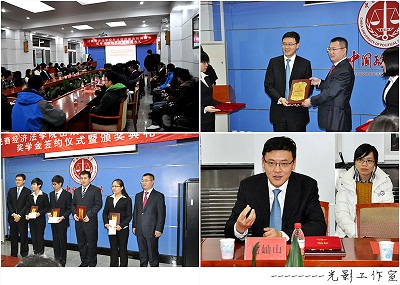 、岳成律师事务所设立奖教金、奖学金的合约,为第一届奖教金获得者易军和刘智慧老师、奖学金获得者朱进姝、钟久星、刘贺元、李福慧等四位同学颁发荣誉证书和奖教金、奖学金。学院还聘请岳屾山律师为学生职业规划与发展指导师。