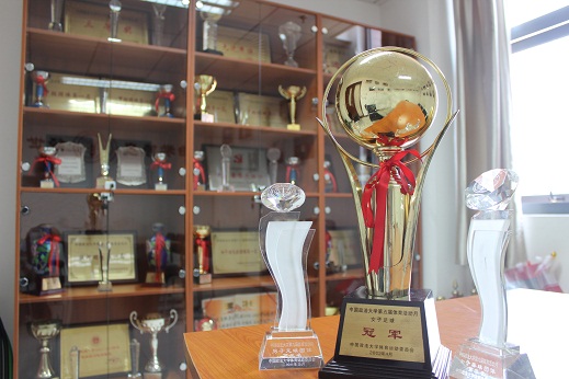 整间展览室最引人注目的便是橱窗里的各类奖杯、奖状,那是民商这个大家庭中的每一个成员努力挥洒汗水、勇敢探索、勤劳拓荒的见证。透过玻璃我们可以看到民商教职工在广播体操中的优越表现,在教学成绩中的不甘落后,在信息化建设中的勇立潮头;我们还可以看到民商学子在拔河中的奋力拼搏,在田径运动会的八年辉煌,在专业实习中的骄人成绩。透过这些奖杯、奖状,我们渐渐了解了民商这十年走过的每一步,矫健而踏实,一步一个脚印,一步一个成绩,一点一滴汇聚成今日橱窗里面的金碧辉煌。