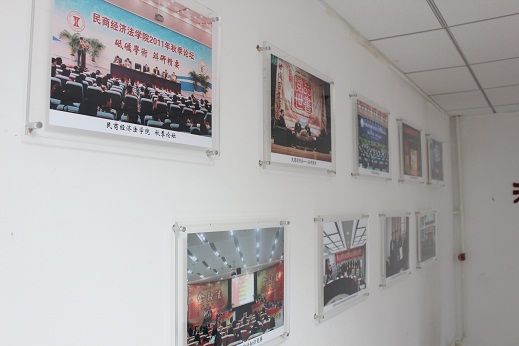 国际化进程卓越成果的诸如与韩国、荷兰等国开展的国际交流活动;另一侧墙上则挂着民商学生工作品牌活动的照片,如“迎新晚会”、“毕业晚会”、“校运动会”和“手拉手,心连心”等活动,照片上一张张鲜活的笑脸彰显着民商的生气。其中以王卫国院长为代表的老师们和毕业生合影的照片更是让我们感受到民商的老师们日日夜夜为学子的付出以及师生之间那种浓浓的情怀。
