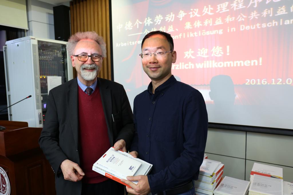 闭幕式由杨飞主持。在主办方、承办方会前的精心策划安排下,研讨会在闭幕式环节掀起了小高潮:沃尔夫冈•多伊普勒教授将其所著的《德国劳动法》(内含亲笔签名)、《德国集体工资谈判制度》和《德国雇员权益的维护》三本著作和教材的中译本亲手赠送给在场每一位中方学者、专家和承担会务工作的研究生,并与之一一合影留念,场面温馨感人。闭幕式最后,克利斯朵夫·帕尔曼和赵红梅分别代表德方和中方做总结性致辞,双方一致认为研讨会取得了圆满成功,对与会学者、专家、同传翻译译员、承担会务工作的研究生的辛劳敬业和智慧奉献表示衷心的感谢,并共同期待未来更进一步加强学术领域的密切合作。致此,“中德个体劳动争议处理程序比较研讨会”圆满闭幕。